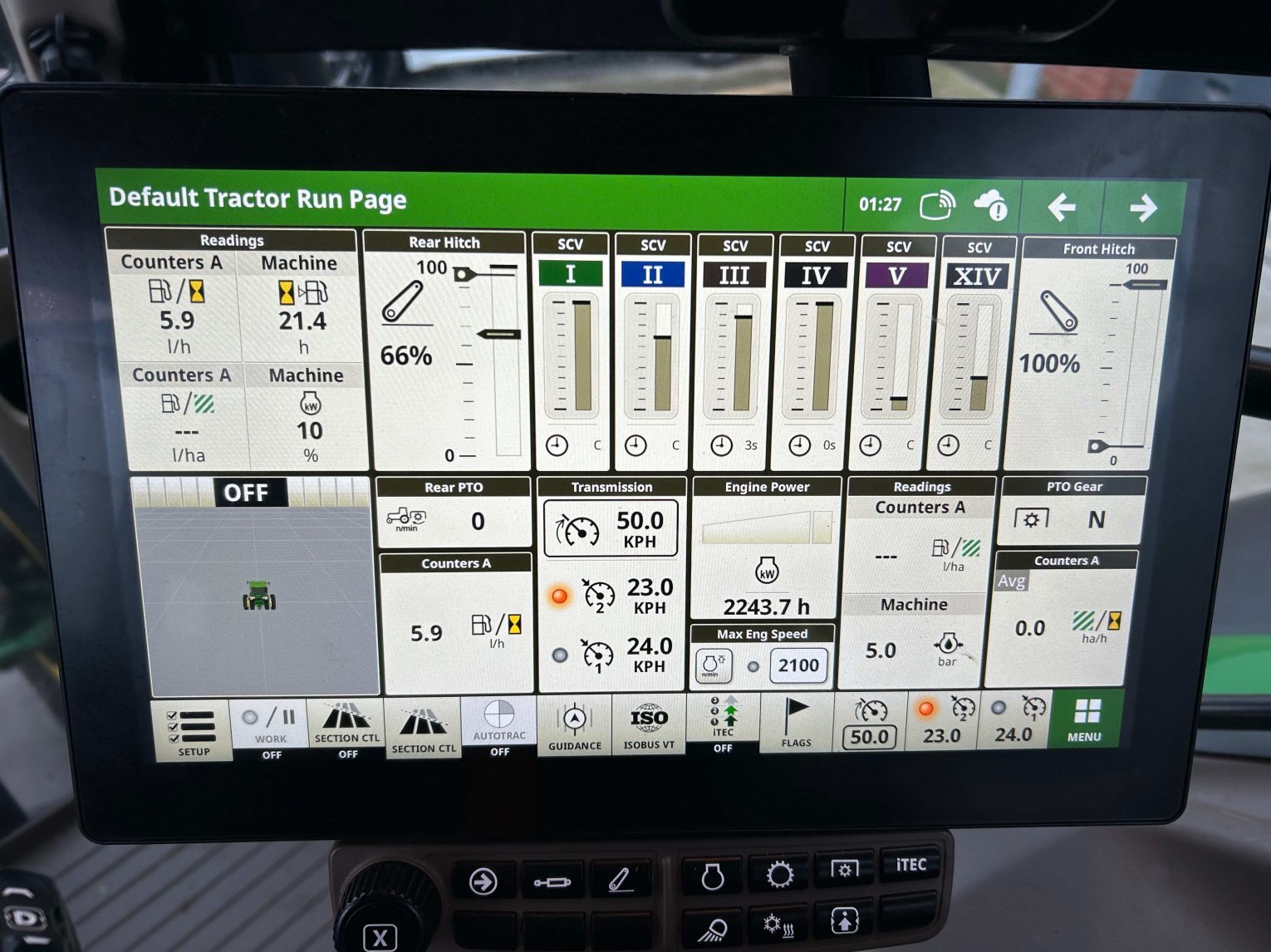 50k Autopower c/w TLS & cab suspension, 5 x ESCVs, Ultimate front linkage, AutoTrac ready, Command arm, Command Pro, premium seat, comfort view cab, 155 ltr/min pump, hydraulic top link, cooling compartment, mudguard kit, additional hydraulic oil reservoir, G5 Plus CommandCenter, Isobus socket for front linkage, beltline road lights, dual beacons, ultimate light package, turnable fenders and VF710/70R42 & VF600/70R28 Bridgestone tyres.